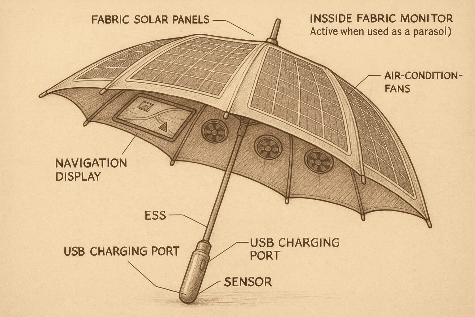- Fabric Solar Panel: 우산 캔버스 외피에 라디얼(방사형) 배열.